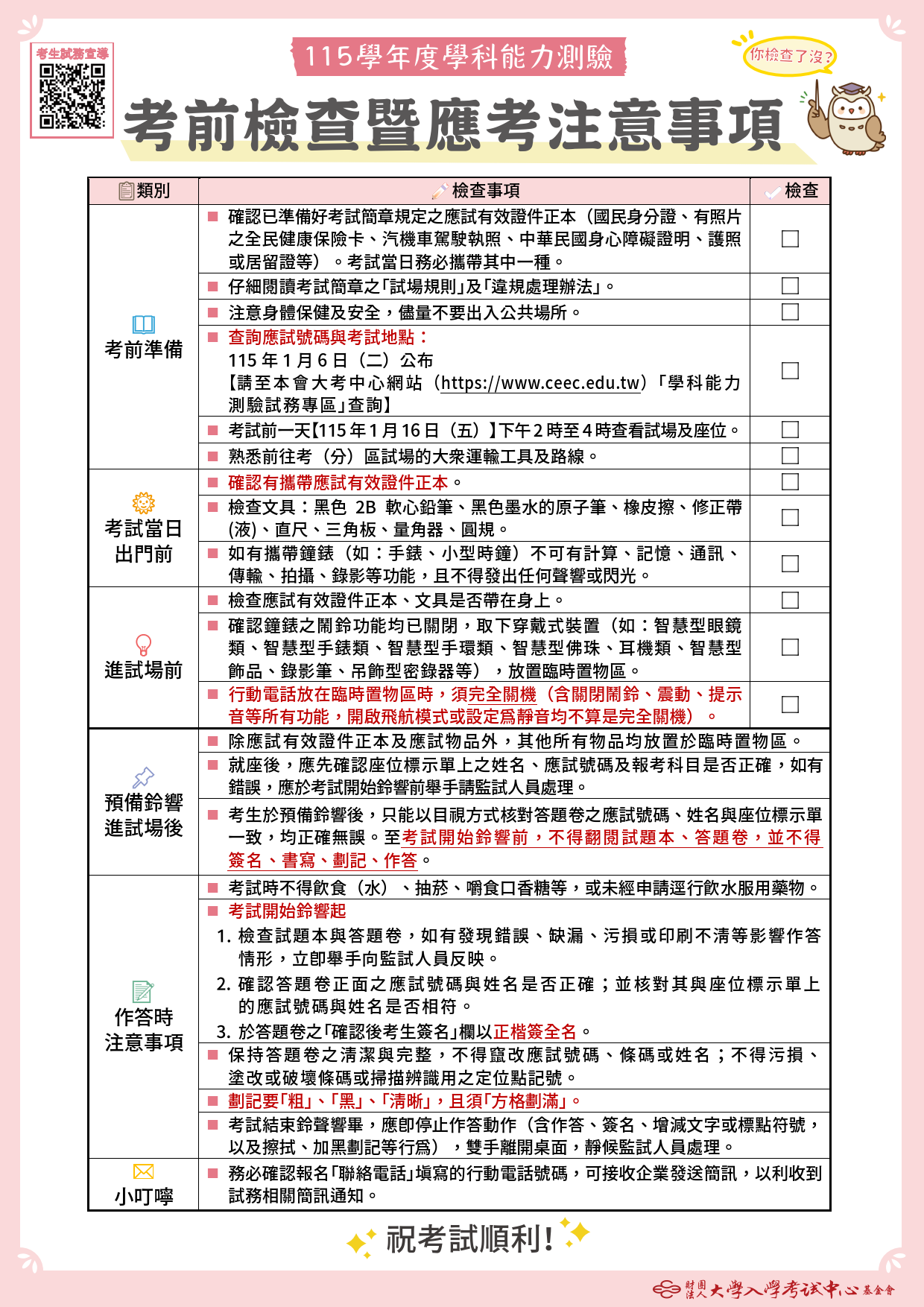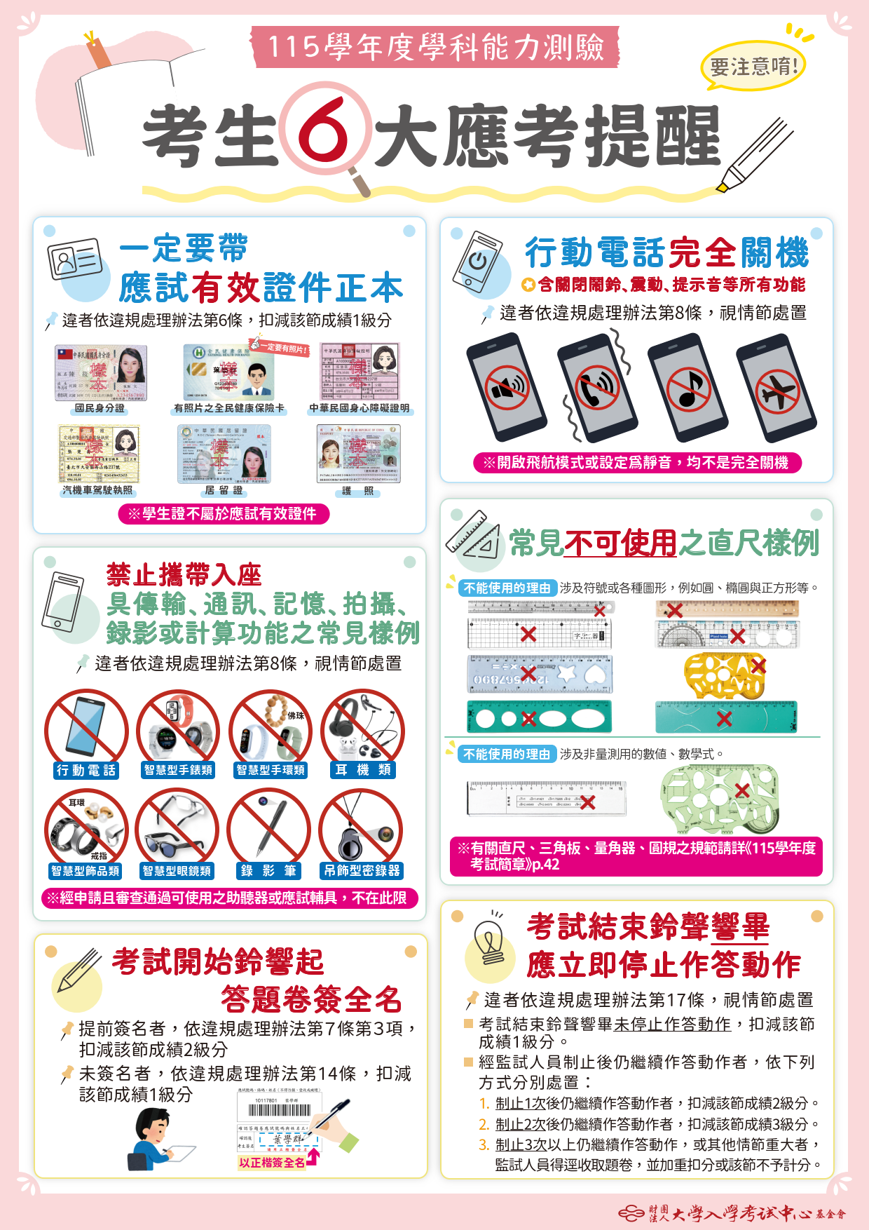 請考生詳閱 115 學年度考試簡章第 41 頁至 51 頁試場規則及違規處理辦法,以避免因為違規被扣減成績。各項違規事項,皆將提請本會大考中心考試委員會審議後決議。「115 學測考生應考提醒與應考檢查表」與學科能力測驗試務相關訊息,可至本會大考中心網站(https://www.ceec.edu.tw)「學科能力測驗」之「考試訊息」與「考生試務宣導」之「影音專區」查覽或下載。