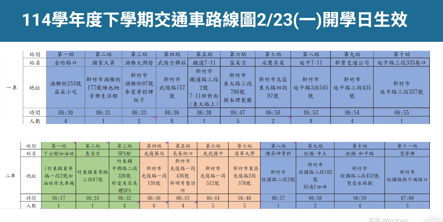 感謝大家積極參與本學期交通車的報名。經過我們的整理與確認,現已完成所有報名的統計工作,並確定了最終的乘車名單。 請各位同學及家長查詢確認。