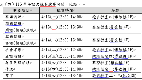 一、為辦理本校115學年度高中語文競賽,相關競賽時間及地點如下,請參賽同學依規定準時報到。