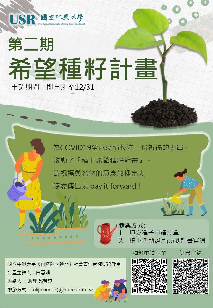 二、希望種籽計畫目的是在為全球疫情中投注一份祈福的力量,啟動了『種下希望種籽計畫』,邀請學校師生共同參與,活動海報如附件。