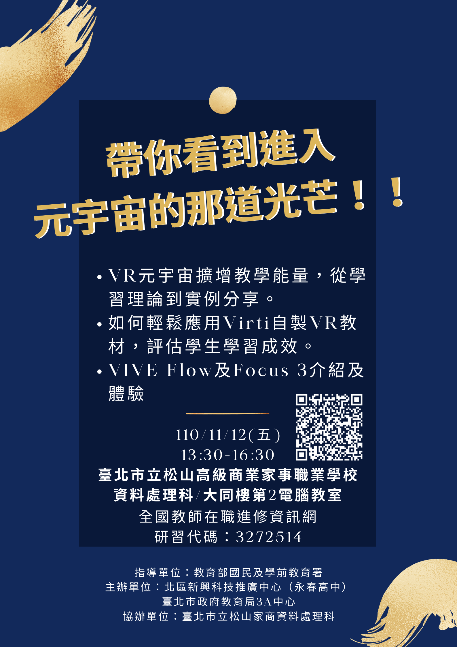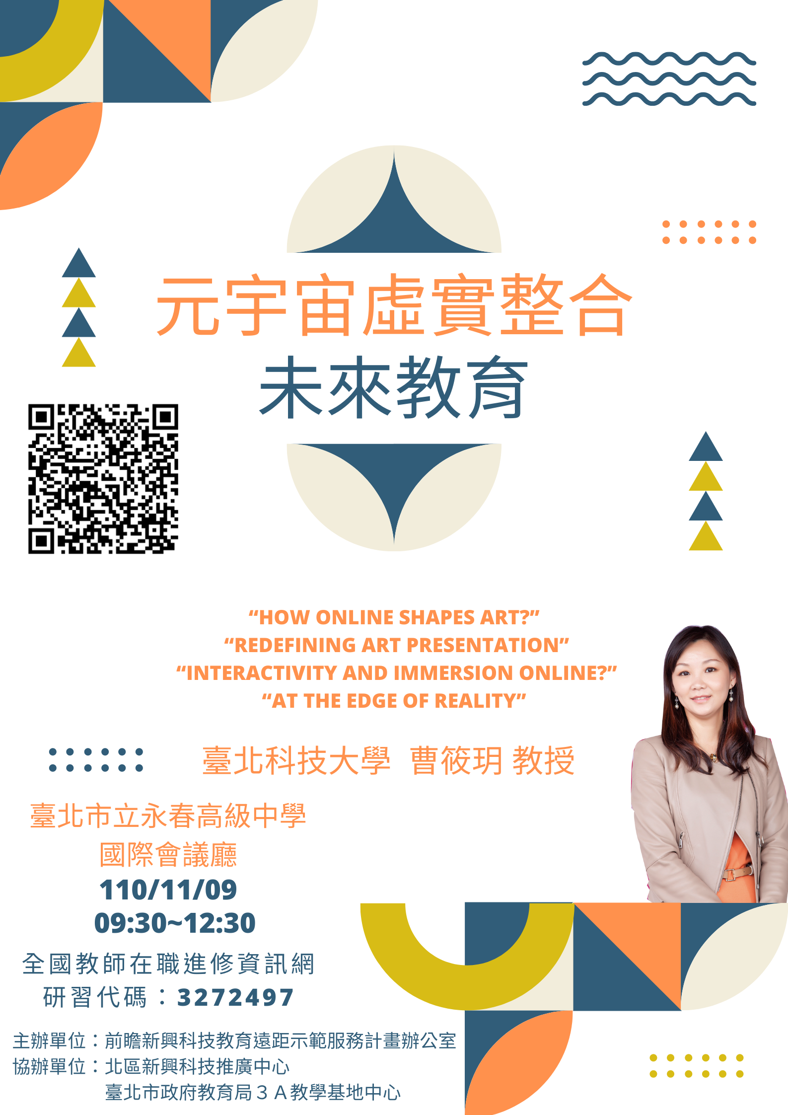 (一) | 元宇宙虛實整合未來教育,110年11月9日(星期二)上午9時30分至12時30分,課程代碼:3272497。 |