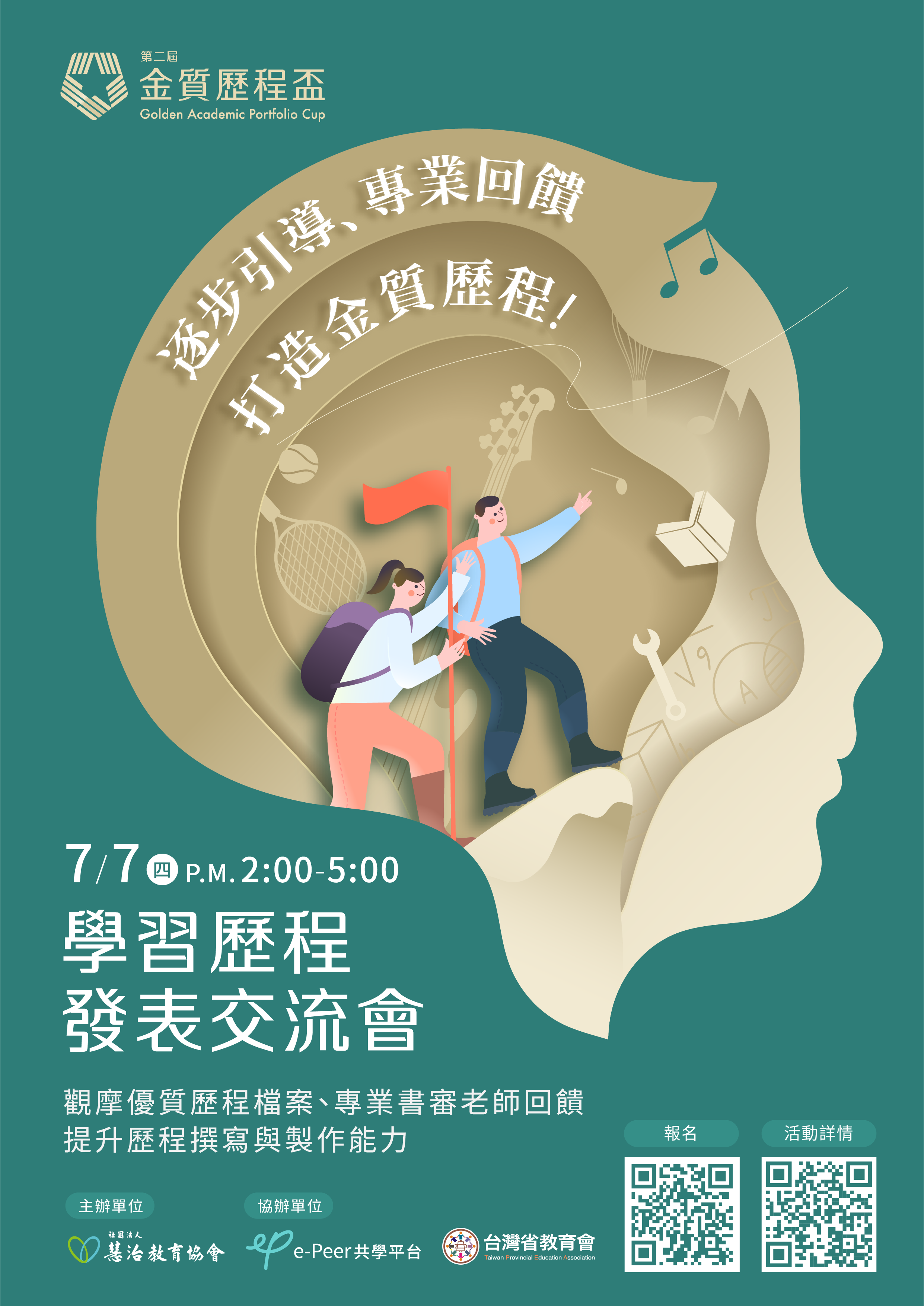 一、 | 慧治教育協會以適性引導的理念推廣智慧科技工具【e-Peer共學平台】讓學生能記錄學習軌跡、探索未來方向。為了促進跨校交流,並提供學生展現自我的舞台,舉辦了【金質歷程盃】發表交流活動,邀請優選同學分享作品成果,由書審老師線上回饋。本次活動還邀請大園國際高中朱元隆校長分享製作學習歷程的實質建議,以及應屆畢業生高雄中學陳承學長分享升學與自我探索之路。歡迎鼓勵貴校教師與學生一同報名參加! |