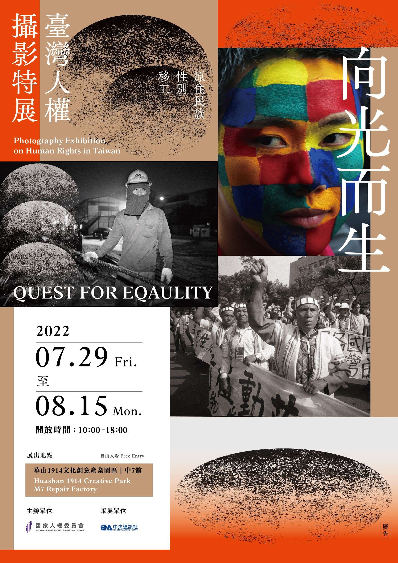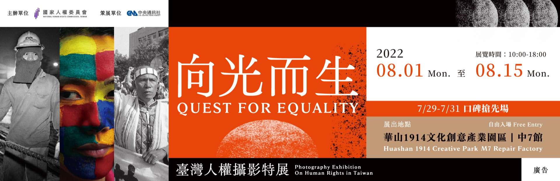二、本展覽期間自111年8月1日起至8月15日止(7月29日至7月31日口碑搶先場),每日上午10時至下午6時,於華山1914文化創意產業園區中7館辦理,全場免費參觀。