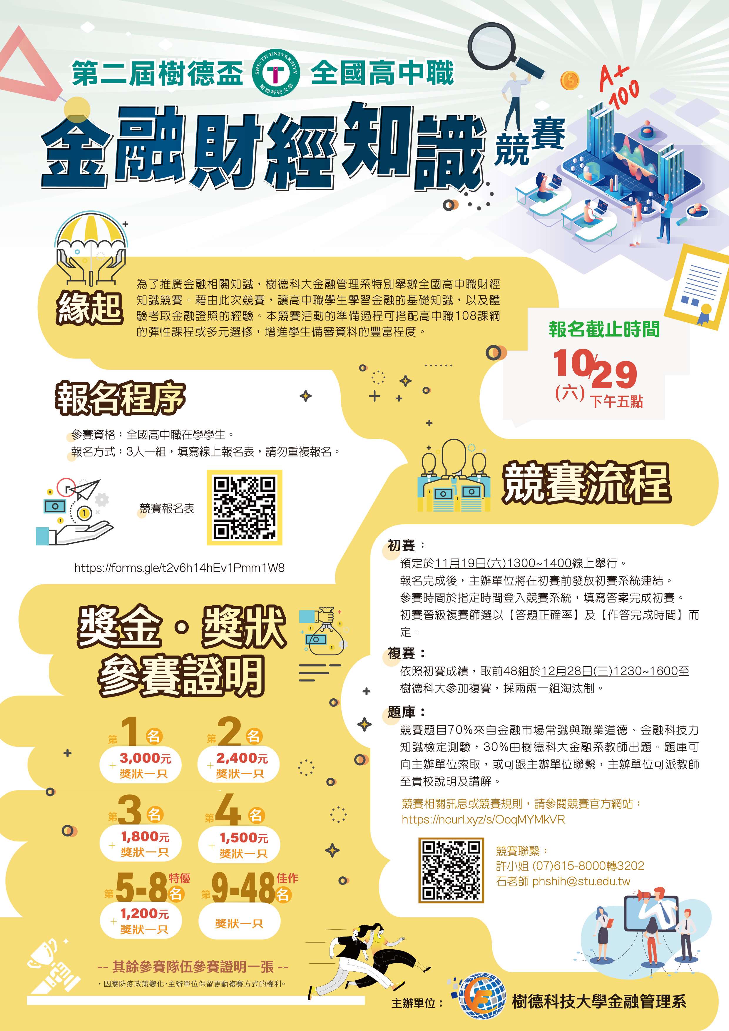 一、 | 為推廣金融知識,讓學生了解金融證照,本校金融管理系舉辦2022「樹德盃」全國高中職金融財經知識競賽,競賽題目將取自金融相關證照,並可搭配108課綱金融基礎教育課程。 |