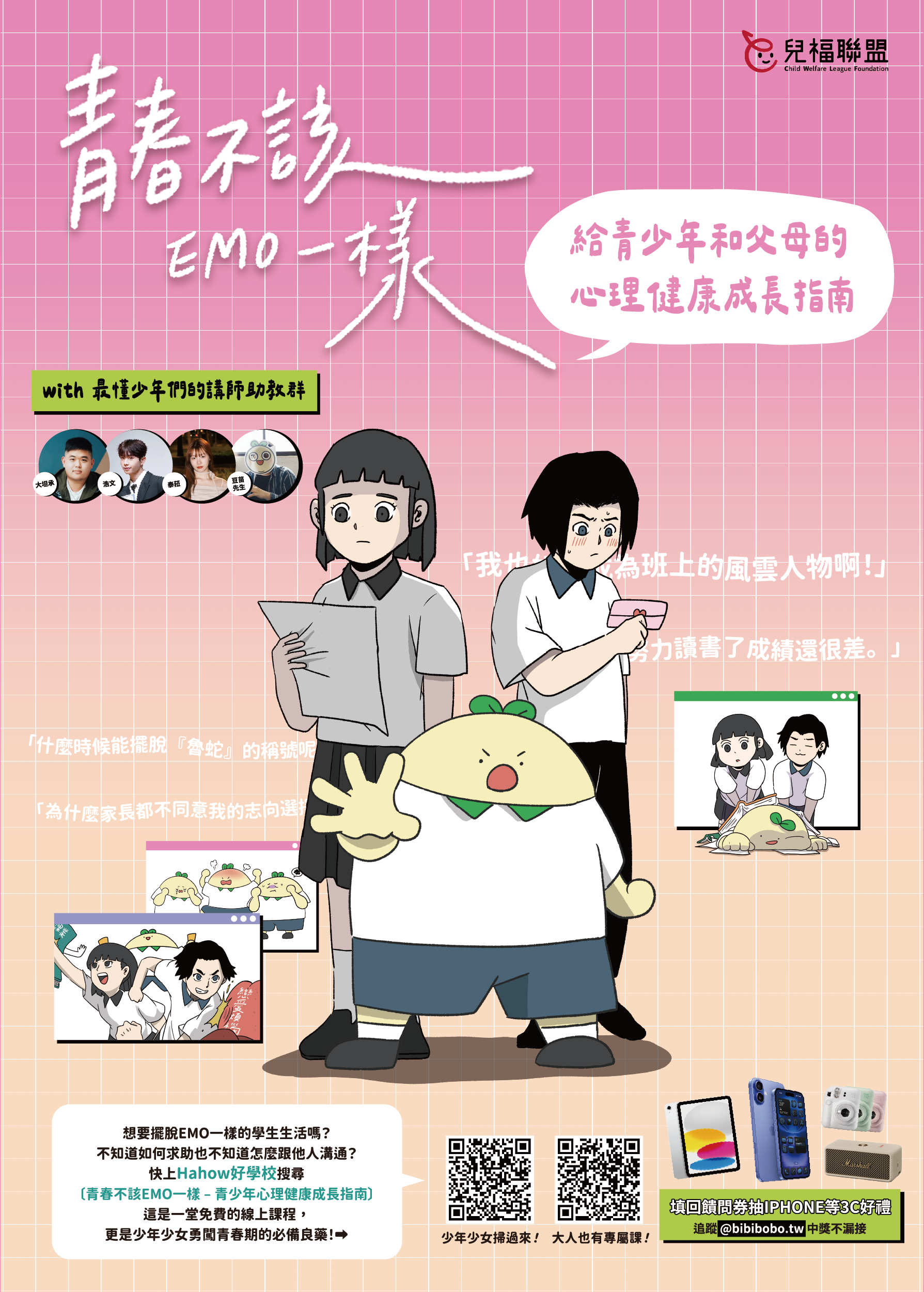 三、 | 本會辦理《青春不該EMO一樣》青少年心理健康免費線上課程,提供系統性的心理保健知識,協助青少年正向面對情緒、抒發壓力,完成課程任務即可抽3C好禮。隨函提供紙本海報,請惠予協助張貼至校內公佈欄,及將電子檔公告於學校官網及班級群組。 |