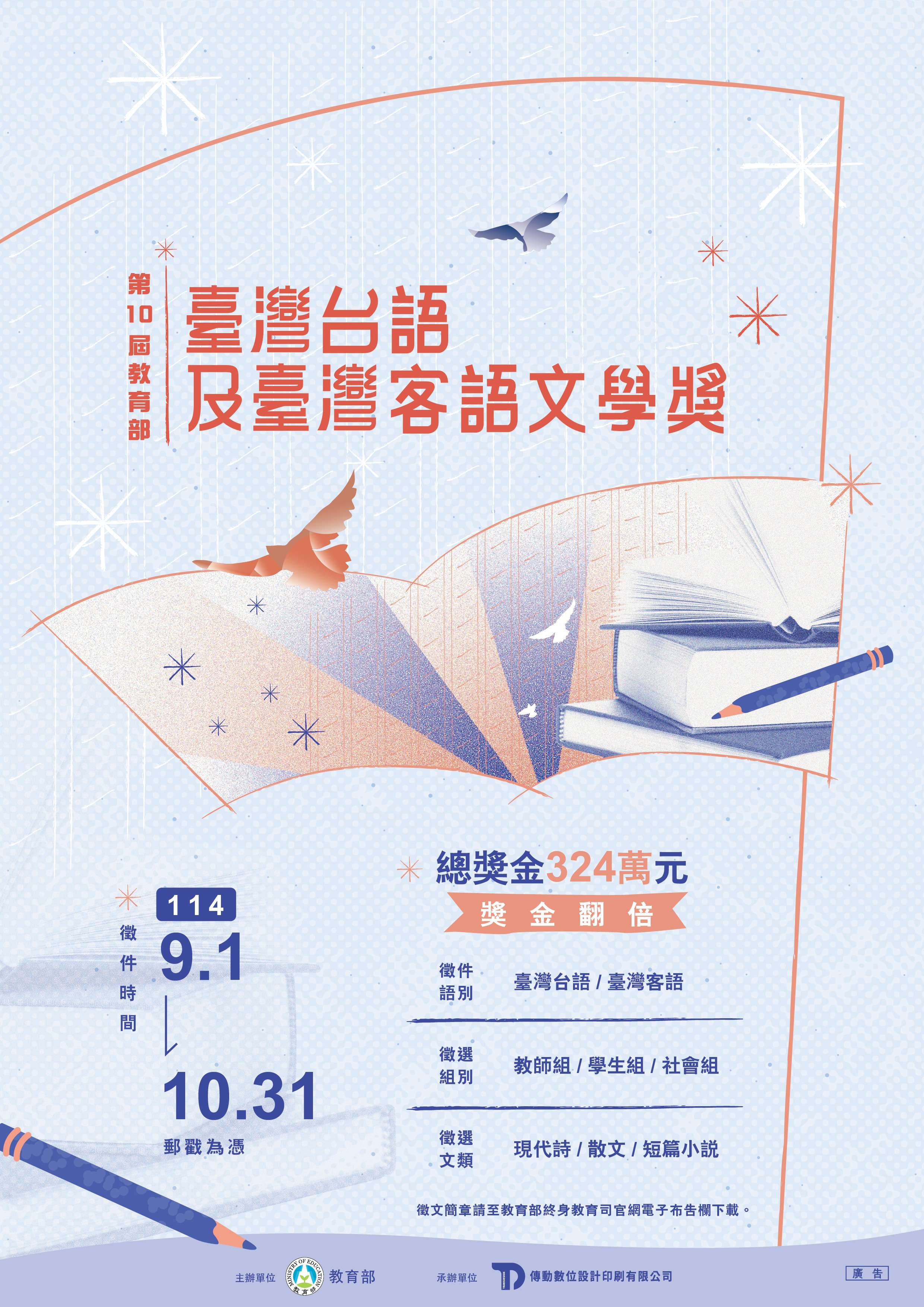 活動徵件日期自114年9月1日起至114年10月31日止,詳情及徵文簡章下載請至教育部終身教育司網站(https://depart.moe.edu.tw/ED2400/Default.aspx)電子布告欄,或電洽:02-8787-5555#123 陳小姐。