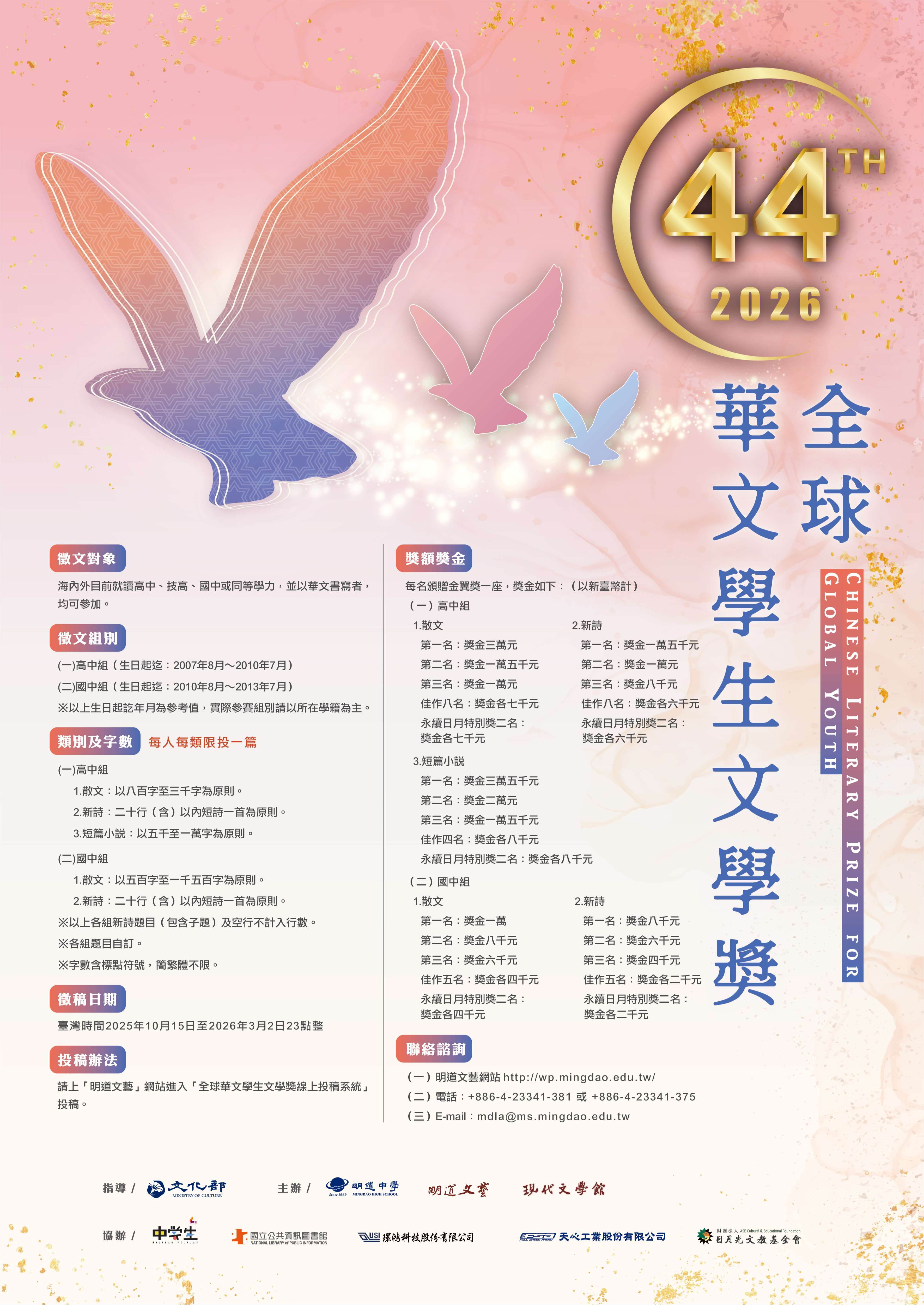 | 一、 | 「第44屆全球華文學生文學獎」徵文對象為海內外目前就讀高中職、國中或同等學力,並以華文書寫者,均可參加。 |