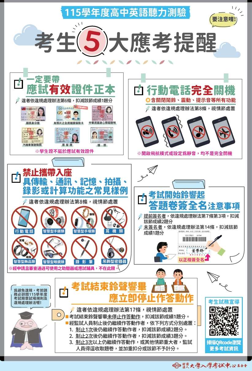 歷年應試違規最大宗為未攜帶應試有效證件正本。請考生務必記得考試當日攜帶應試有效證件正本,以供身分查驗。應試有效證件包括:國民身分證、有照片之全民健康保險卡、汽機車駕駛執照、中華民國身心障礙證明、護照或居留證。另提醒學生證、無照片的健保卡都是無效證件。