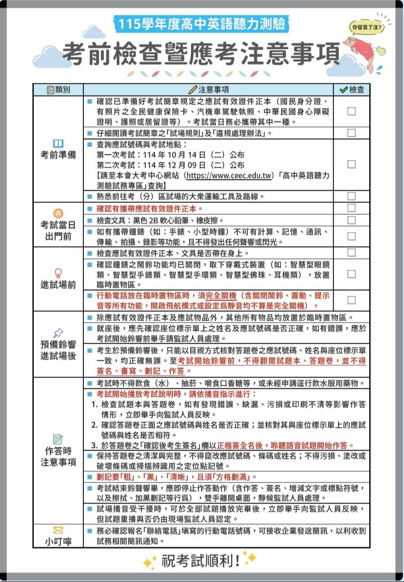 應考資訊(含應試號碼、考試地點)與試場分配表採一次性公告,於 12 月 09 日(二)上午 9 時起,於大考中心網站(https://www.ceec.edu.tw)高中英語聽力測驗之「試務專區」供考生查覽。