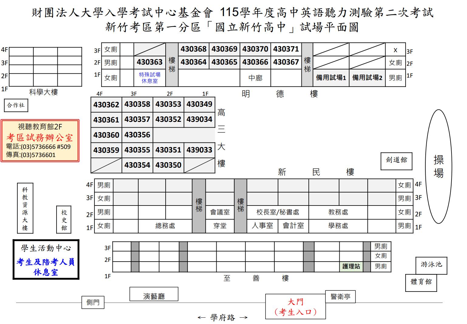 由於英聽測驗不開放考生查看試場,請考生務必上網查詢個人的詳細應考資訊,包括應試號碼、確切考試地點及試場平面圖,以利考試當日能快速進入考(分)區學校及所屬試場應試。