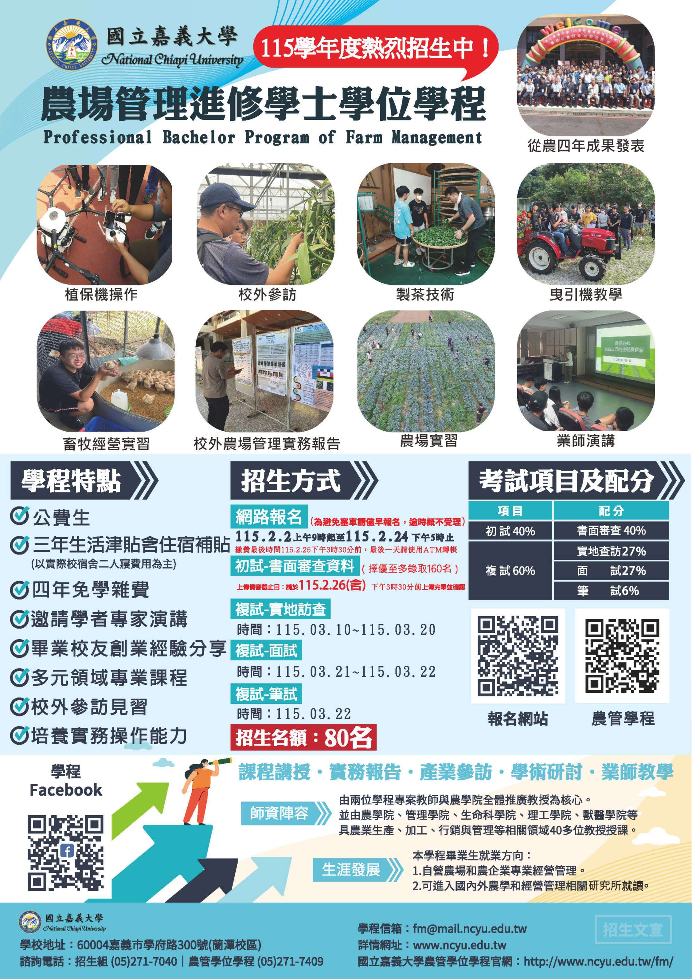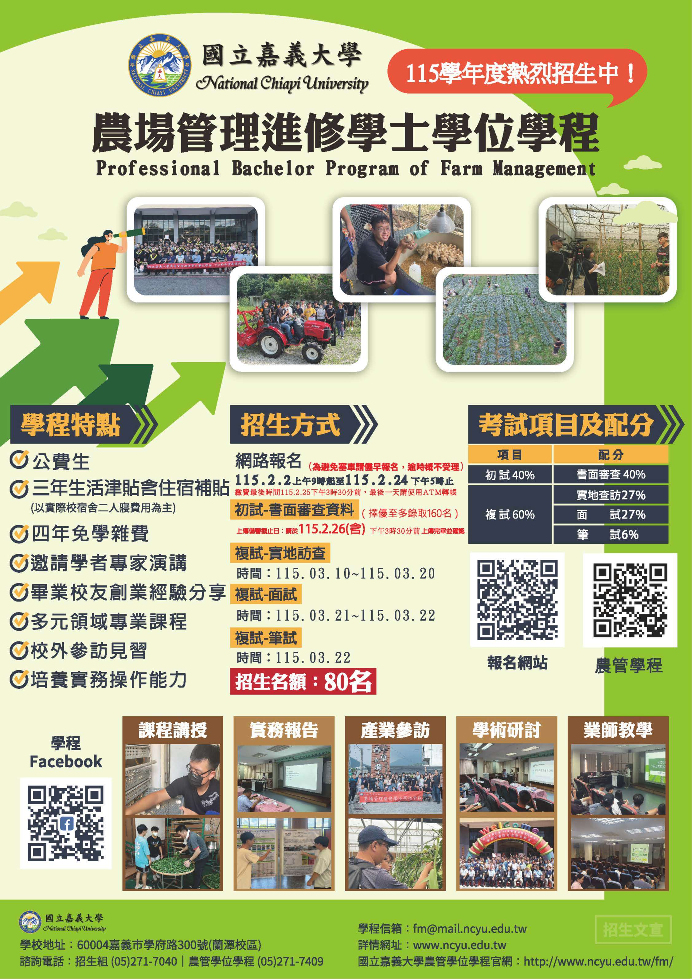 洽詢電話:農場管理進修學士學位學程 05-2717409
