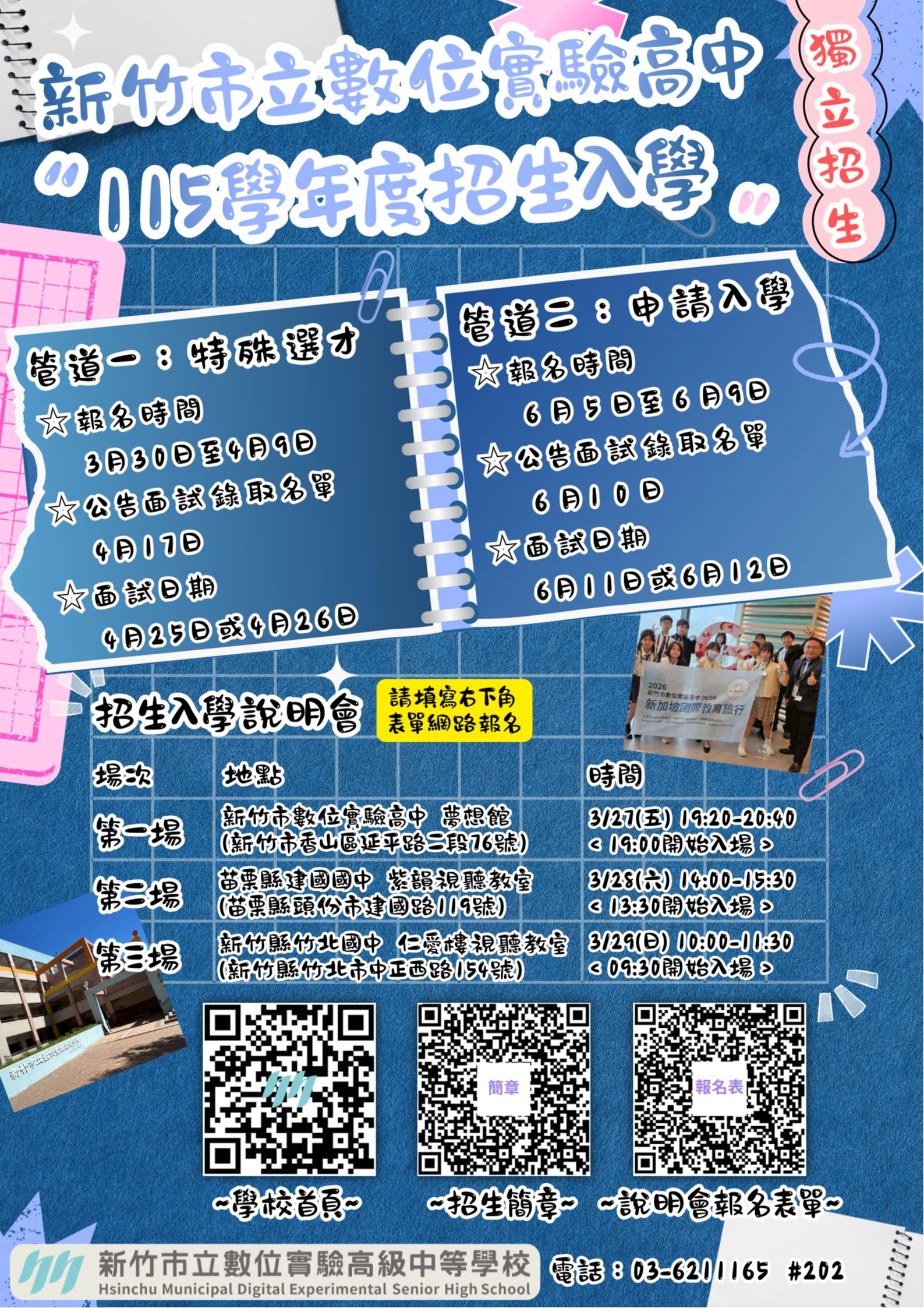 新竹市立數位實驗高級中等學校將於3/27-3/29辦理三場實體招生入學說明會,歡迎親師生就近選擇場次報名,報名連結為:https://pse.is/8ukye9。因場地座位有限,若額滿將停止報名。各場次資訊如下,其他詳細資料請參閱附件二: