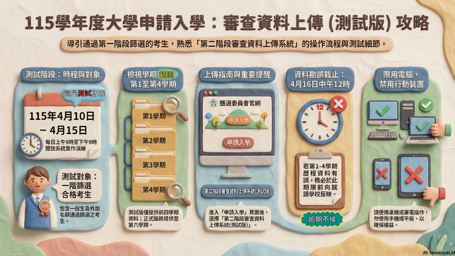 (四) 考生登入後可檢視學習歷程中央資料庫第一至第四學期之學習歷程檔案資料;正式版期間(115年4月30日至115年5月6日),登入後可檢視學習歷程中央資料庫第一至第六學期之學習歷程檔案資料。
