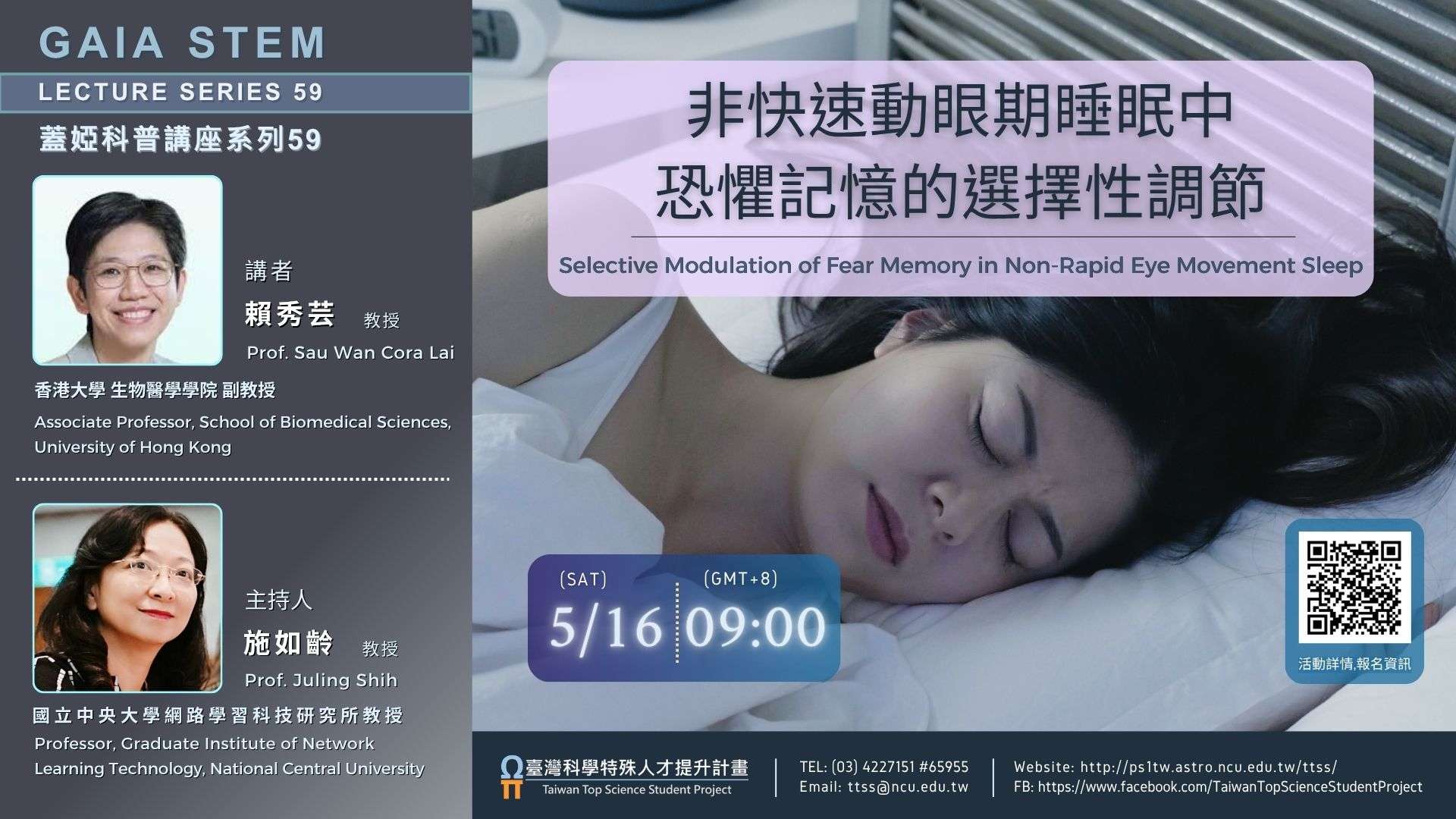 | 一、 | 本次講座邀請香港大學生物醫學學院的賴秀芸教授擔任主講,賴教授主要研究記憶如何影響行為、恐懼制約與睡眠在情緒學習中所扮演的角色等,並關注學習與記憶相關的神經機制。本次演講將以非快速動眼期睡眠為切入點,帶領聽眾認識睡眠與記憶之間的關聯。 |